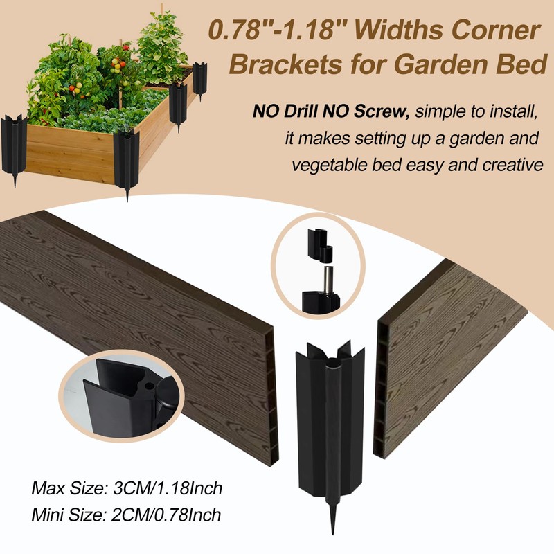 - Versatile Fit: The corner brackets is 6 inch* 8 pcs with extra fixed stakes, use for wooden boards between 0.78-1.18 inches in width. You can install 2 x 6 inch high garden beds, or one 12 inch high fraised garden bed.