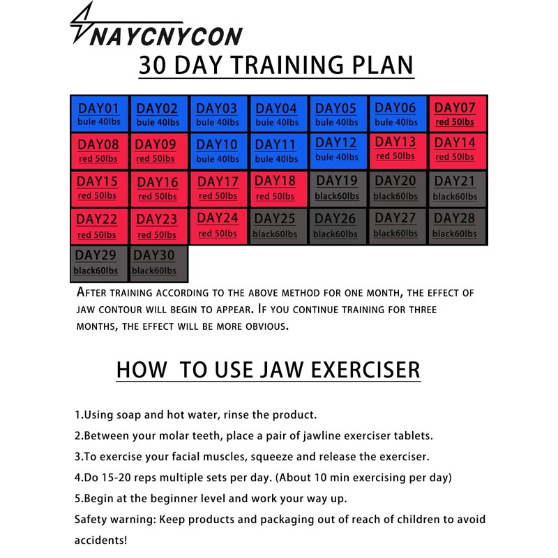 - Three levels: The Jaw Trainer is made of silicone suitable for beginners, Intermediate & Advance users (30 lbs, 40 lbs, 50 lbs ). Only need just 10 minutes of daily chewing jaw trainer you can achieve a defined jaw