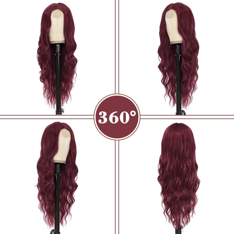 NAYOO Long Wine Red Wavy Wig for Women 26 Inch Middle Part Curly Wavy Wig Natural Looking Synthetic Heat Resistant Fiber for Daily (Wine Red)