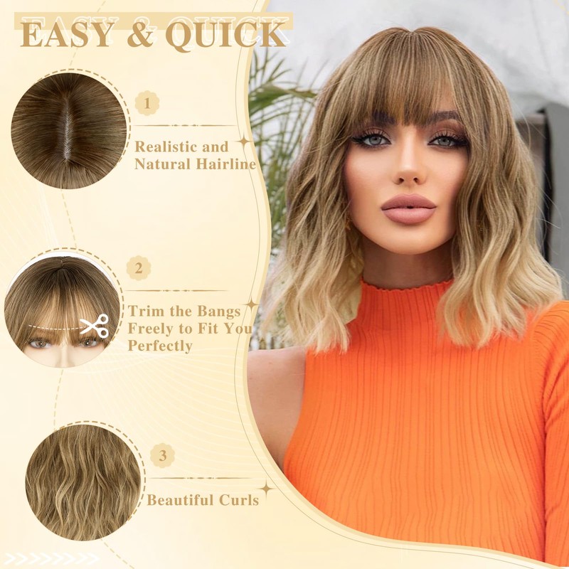 NAYOO Ombre Blonde Wig with Bangs, 14 Inch Bob Wig with Bangs for Women, Shoulder Length Short Wig, Glueless Short Wig