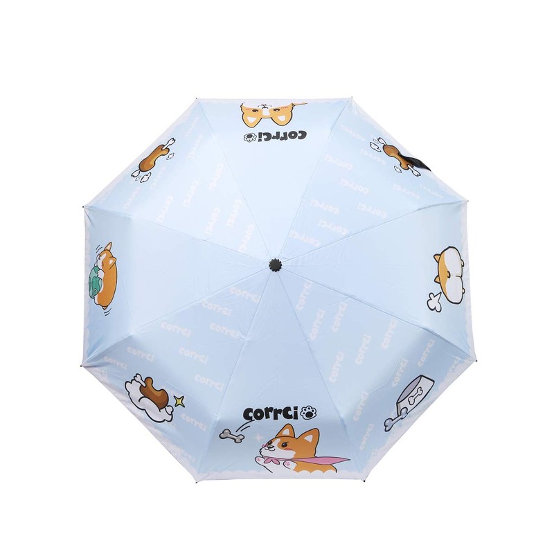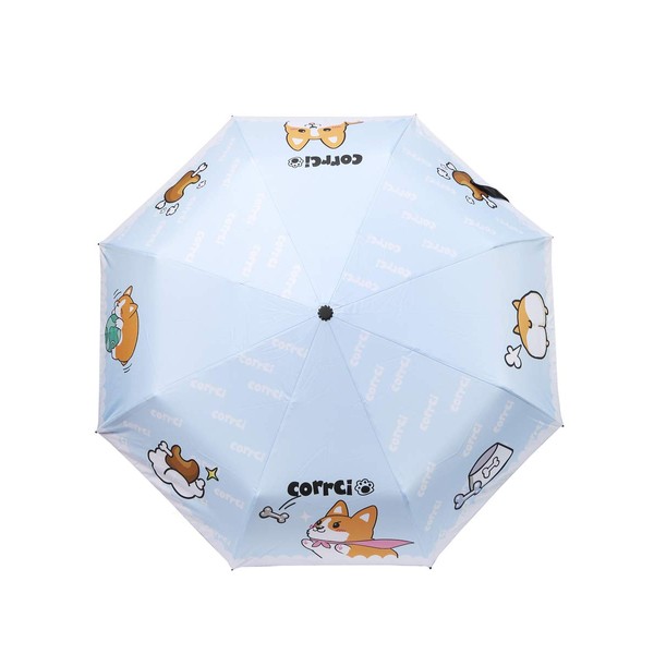 - Corgi Themed Umbrella: This super cool windproof umbrella is the perfect way to keep you safe from rain or sun when you are enjoying the day with your furry friend. Our cute umbrella has a Corgi cartoon print on a blue top with a black inside lining.