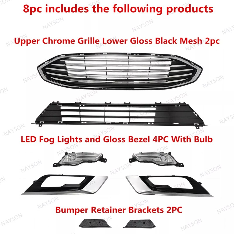 NAYSON For Fusion 2017-2018 Upper Chrome Grille/Lower Mesh/Fog Light Kit/Bumper Bracket