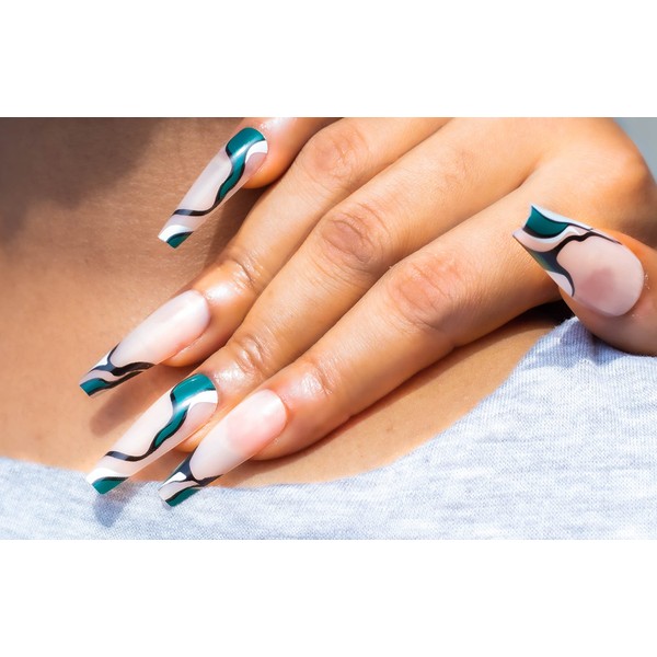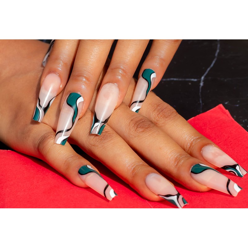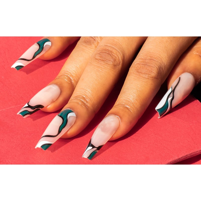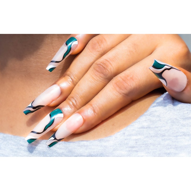 NayToe Nailz Press on Nails – Premium Reusable Press On Nails with Fun Scally Green Print - Press On Nails Long for Stylish Manicures – 24 Nails with Nail Glue for Press On Nails and Adhesive Tabs (Green and White Swirl)