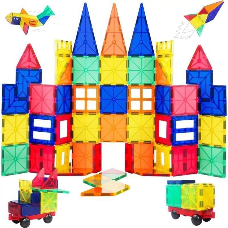 Azulejos de construcción magnéticos: Total: 120PCS (118 formas básicas, 2 COCHES), hermosa caja de regalo con LIBRO DE IDEAS además de que todos nuestros azulejos de construcción tienen magnetismo. NO letras y números no magnéticos inútiles