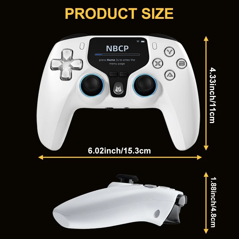 Take your gaming experience to the next level with the NBCP WOLF-V6 Wireless Controller — a feature-packed, pro-grade controller engineered for versatility and performance. Its smart interactive screen allows you to directly configure vibration strength, macro commands, lighting, and joystick sensitivity without any app. With dual macro back buttons, Turbo mode, and customizable settings, you’ll gain a competitive edge in every battle. Whether you game on PC, Switch, Android, iOS, or PS3, this controller’s tri-mode connectivity and 1000Hz polling rate ensure seamless, ultra-responsive gameplay. Built with hall effect technology to eliminate stick drift and featuring the same premium vibration motors used in Sony’s official controllers, the WOLF-V6 delivers an immersive and durable experience. And with a 3.5mm headset jack for in-game audio, every detail is designed to elevate your play.