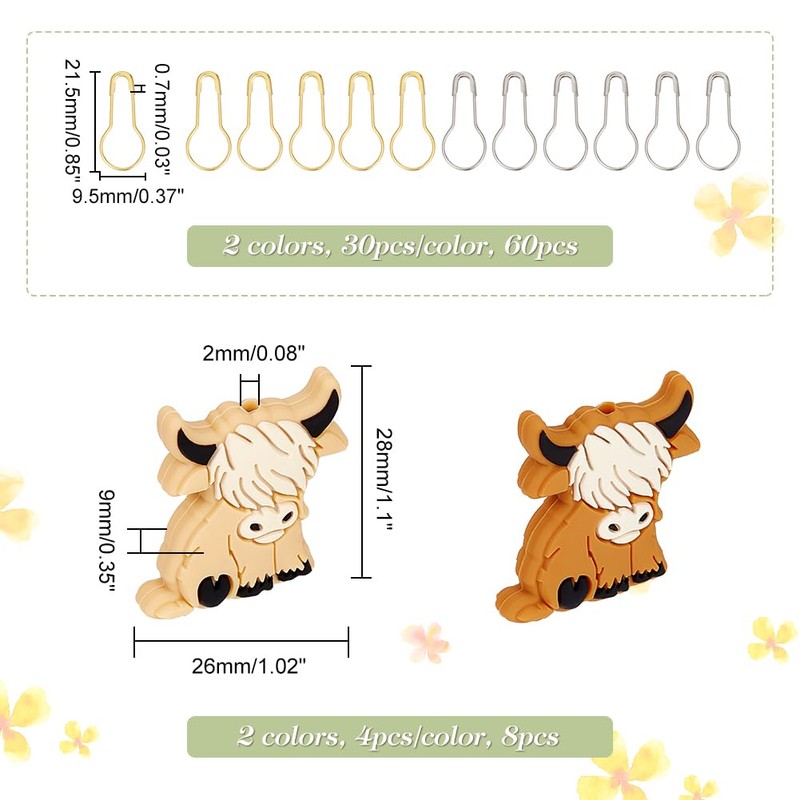 - Value Package - You will receive 8 pieces of cattle silicone beads, 60 pieces pumpkin safety pins, cattle beads: 2.8 x 2.5 cm wide and long, hole: 2 mm, 2 colours, 4 pieces. Each colour, safety pin: 21.5 mm long, 9.5 mm in width, enough quantity to meet your daily needs