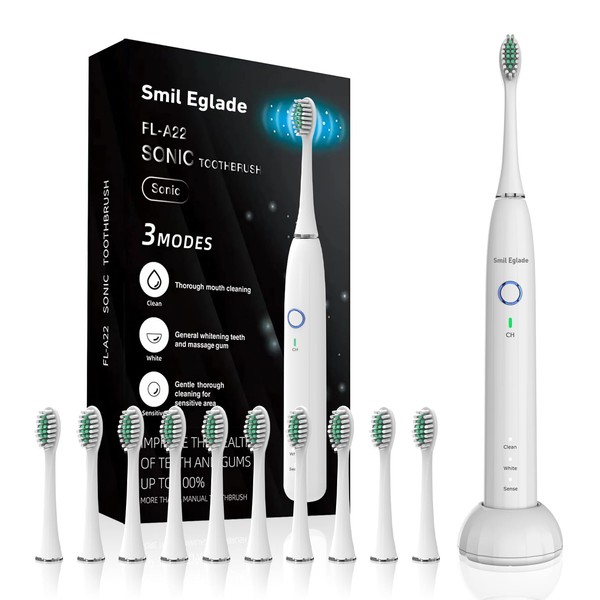 NBGRLVS Rechargeable Sonic Electric Toothbrush for Adults with 10 Brush Heads, 3 Modes, 2 Minute Smart Timer and Fast 4 Hour Charge - Perfect for Travel and Easy Dental Care (White)
