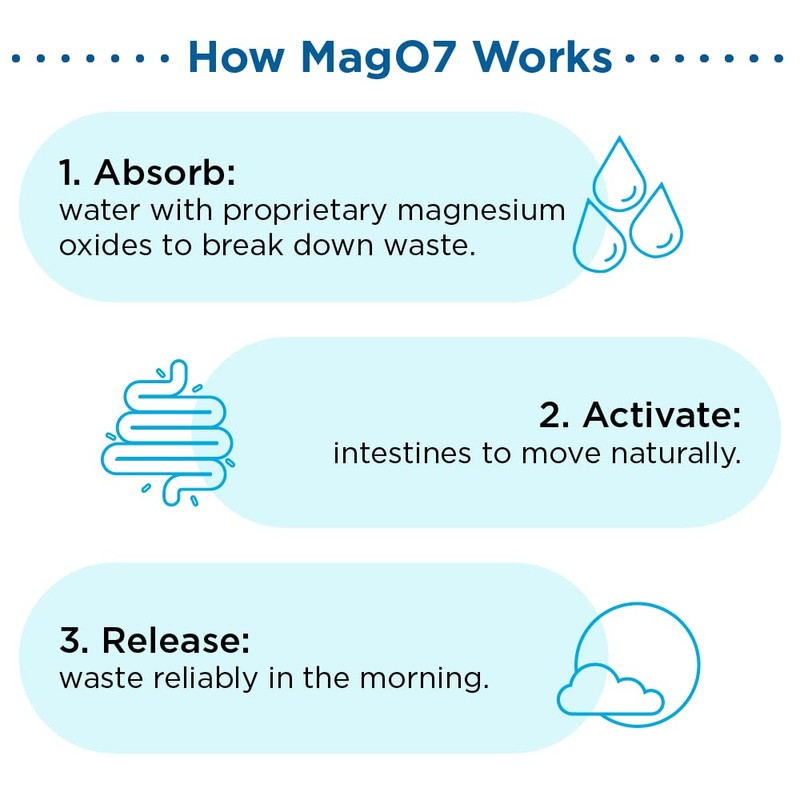 - OVERNIGHT COLON CLEANSER & DETOX - Simply take MagO7 before bed, on an empty stomach, for a reliable morning bowel movement and elimination of waste.