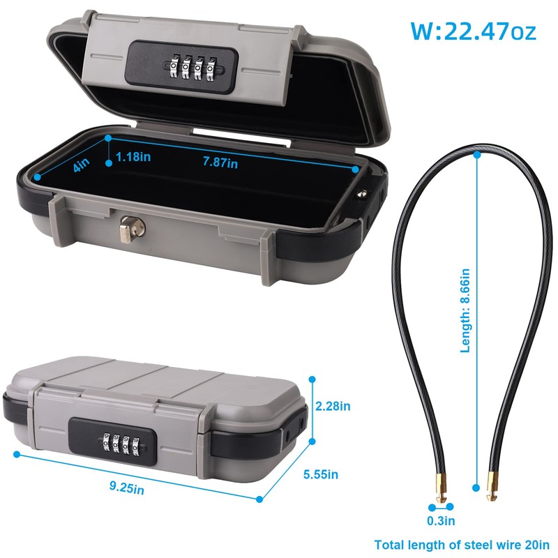- 【Our security casesize】 9.25in x 5.55in x 2.28in(L*W*H), this security safe box will be your perfect assistant when traveling or business trip, making it easy to put in your backpack and luggage; Internal size: 7.87in x 4.02in x 1.18in(L*W*H), it can safely store your cell phone, USB cable, power supply, passport, cash, credit cards, watches, jewelry and more. Wire hook length: 19.69in; Wire diameter: 0.24in; Package weight: 25.19oz; Product weight: 22.47oz
