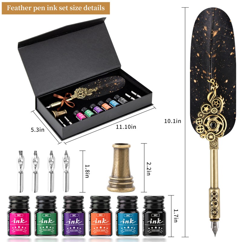- 【FEATHER PEN INK SET INCLUDES 】1x Quill Pen, 6x Bottles of Ink (Black, Green, Blue, Purple, Red, Orange), 4x Stainless Steel Nibs In Different Sizes, 1x Pen Holder, 1x Beautifully Boxed Gift.
