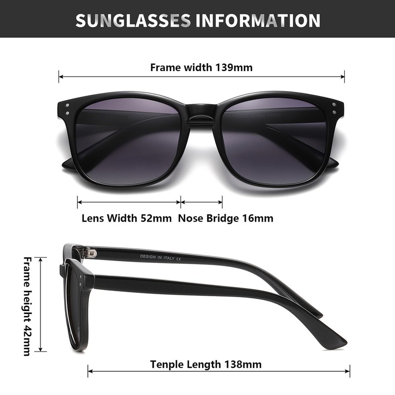 - Package Contents and Dimensions:Classic Polarized Sunglasses*3, Eyewear Pouch*3, Eyewear Cloth*3, Packing Box*1 :The sunglasses dimension is:lens width: 52mm (2.04 inches), lens height: 42mm (1.65 inches), temple length: 138mm (5.43 inches) and nose bridge: 16mm(0.62inches).