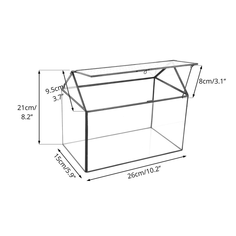 - This is a house shape geometric terrarium made of tin-selaed glass panels, with a swing acrylic lid housing multiple airhoes to allow good ventilation.