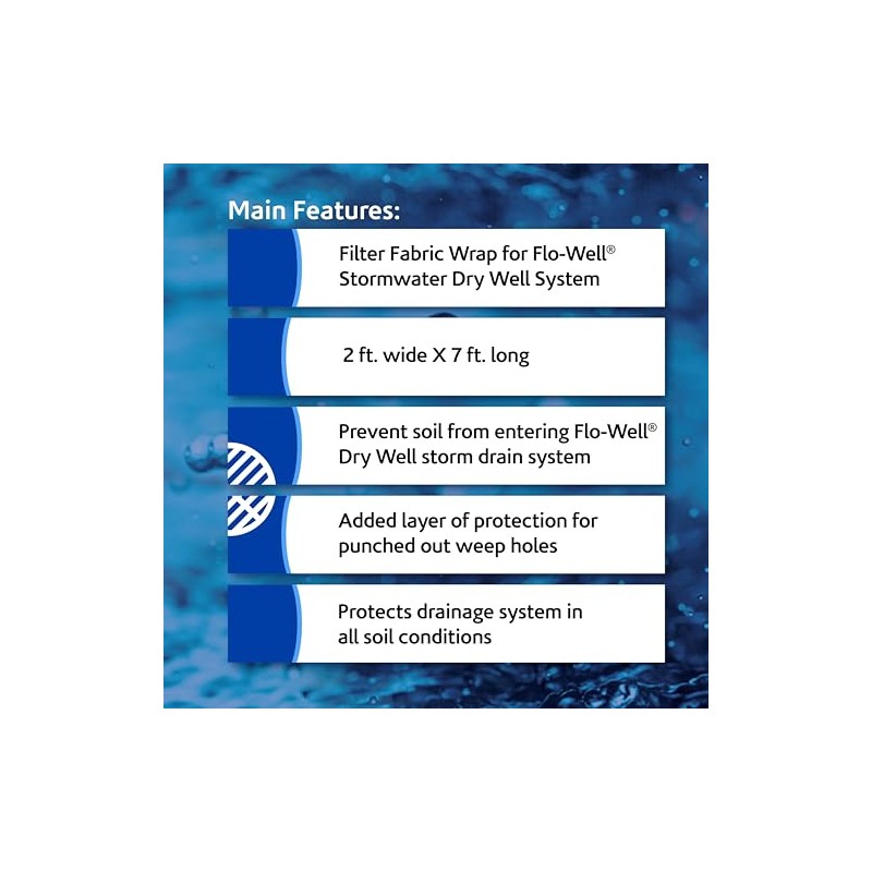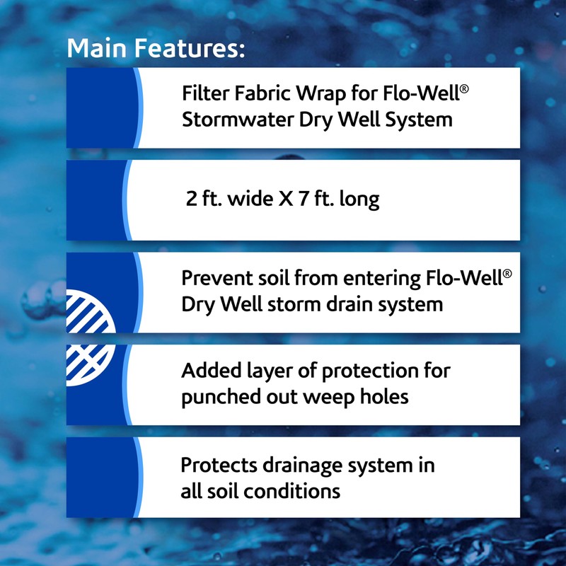 - PROTECTS THE DRAINAGE SYSTEM: The filter fabric works with the Flo-Well Dry Well system to prevent soil from entering the punched-out weep holes of the dry well and potentially clog the drainage system; ideal for erosion control