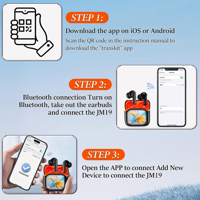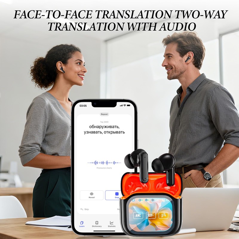 - 【LCD Touch Screen Control】With an intuitive LCD color display, these language translator earbuds let you control over 15 functions directly from the earbuds, including music playback, volume adjustment, EQ modes, language selection, alarms, stopwatch, and even remote camera control. No need for your phone — everything is accessible directly through your ai translator earbuds