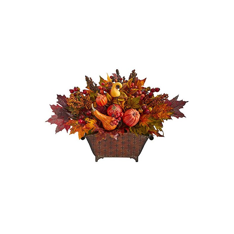 • Have fun with pumpkin, maple leaf, and berries ; Trick and delight guests with a DIY look ; Blends with seasonal decor ; Housed in a metal vase with faux grass