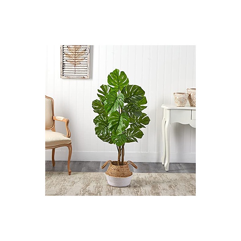 Nearly Natural 4ft. Monstera Artificial Tree in Boho Chic Handmade Cotton & Jute White Woven Planter UV Resistant (Indoor/Outdoor)