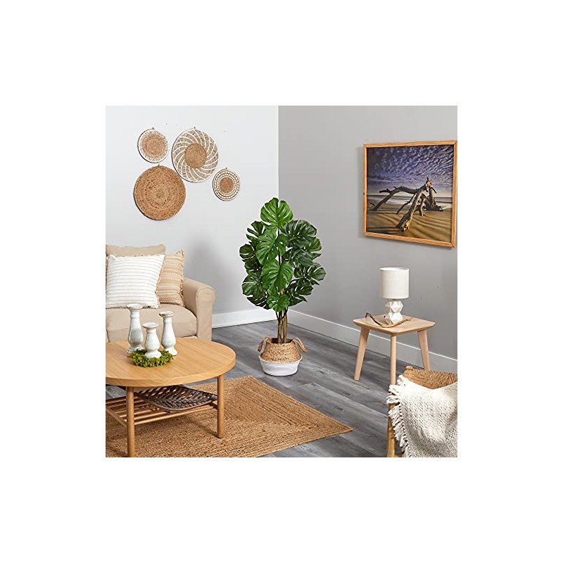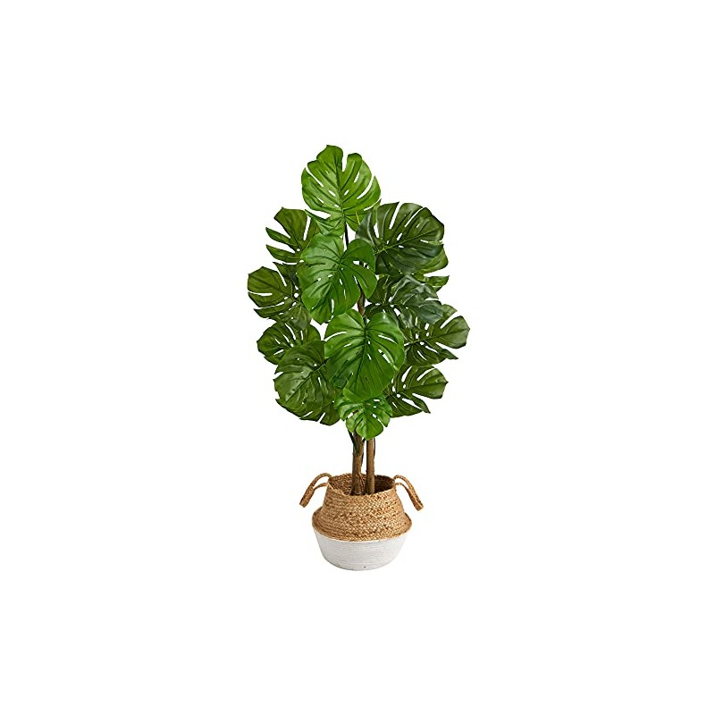 - Trendy, faux Swiss Cheese Plant ; Realistic looking large, Monstera leaves ; Housed in a jute planter ; Safe for outdoor use ; Provides wear-resistant greenery ; Item will need to be re-shaped when removed from the box; this tree can easily bend for reshaping purposes - please separate and fluff to achieve desired fullness