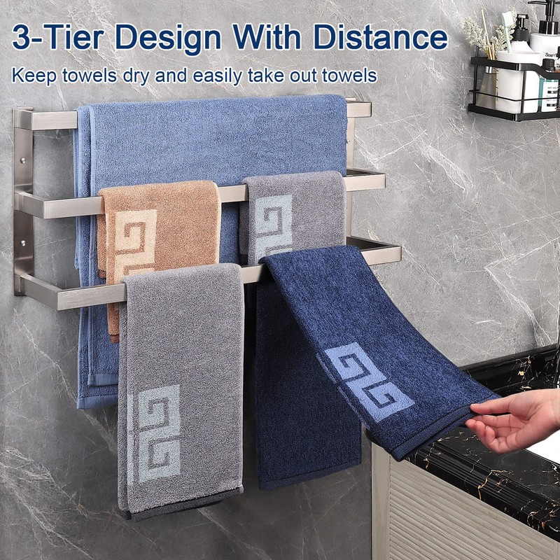 NearMoon Bathroom Towel Bar, Towel Rod Holder, Square Shelf Rack Hanging Towel for Bath, Thicken SUS304 Stainless Steel Towel Rack Wall Mounted-3-Tier Bathroom Accessories (24 Inch, Brushed Nickel)