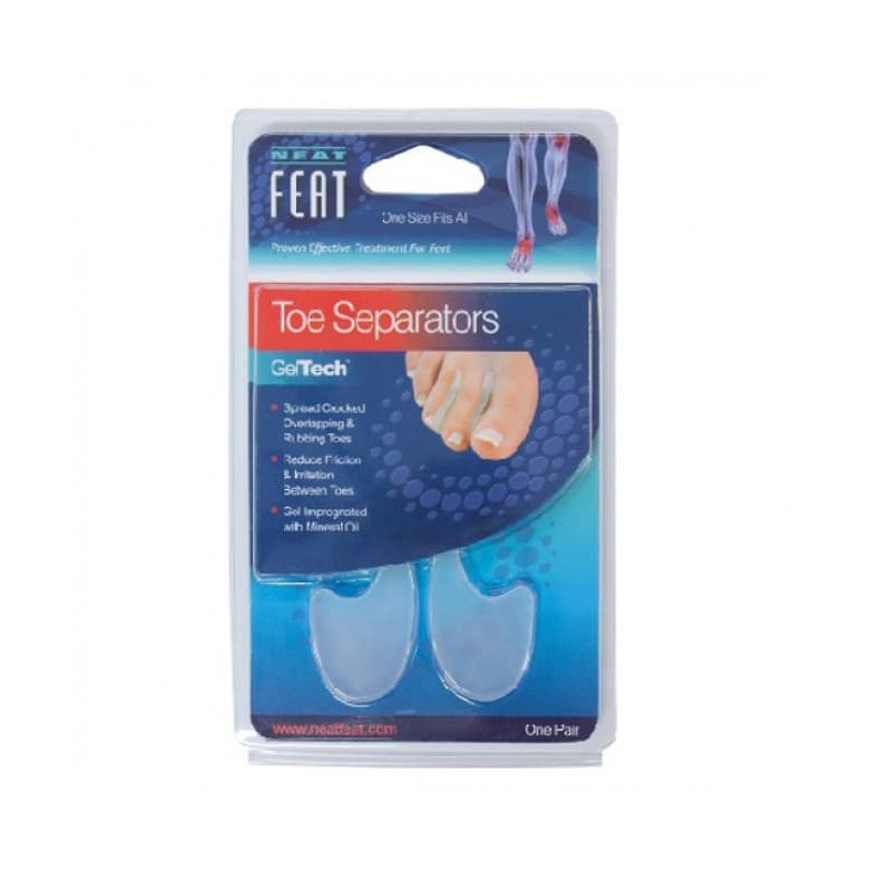Neat Feat Gel Toe Separators are narrow gel inserts designed to fit in between the smaller toes. Gel Toe Separators are made from soft medical grade gel and gently spread crooked, overlapping and rubbing toes.