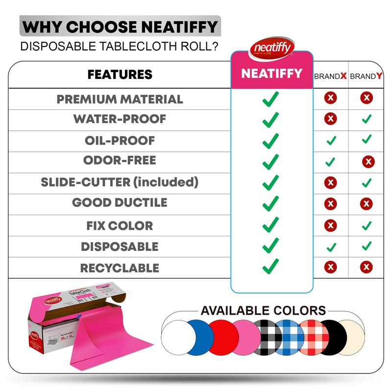 - ✔️SLIDE-CUTTER FOR CUSTOM LENGTH: Cut to suit your preference and party needs! Each roll of tablecloth is equipped with a slide cutter, allowing you to create a perfectly sized plastic cover for Rectangle, Square, Round or Oval tables. Our covers are neatly rolled in a box, so you can cut as much as you need while keeping the rest for later.