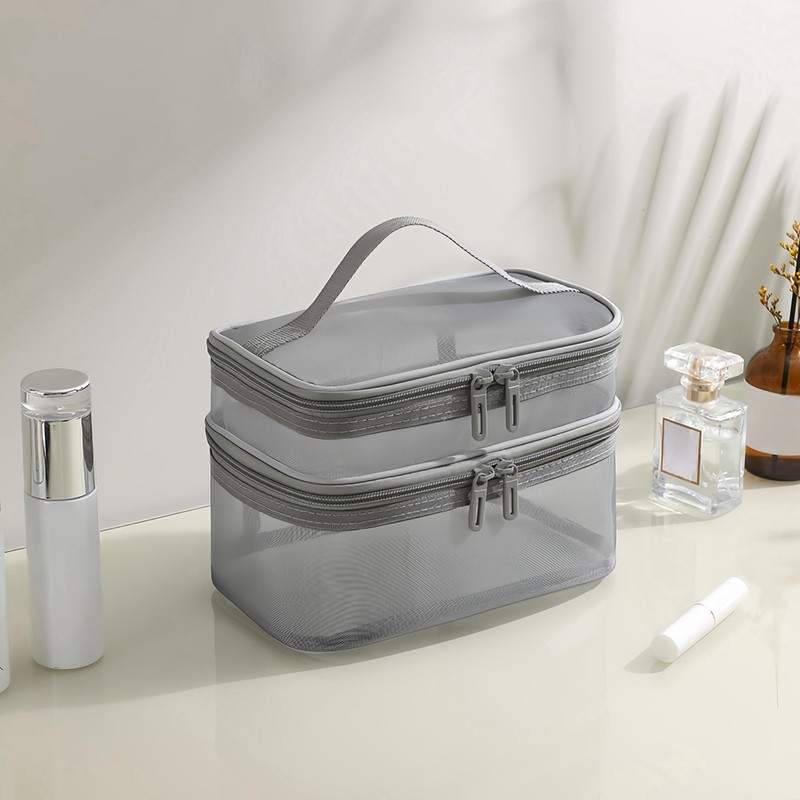 Neceser de Doble Capa, Neceser de Viaje Neceser de Malla de Gran Capacidad con Compartimento para Cepillos y Asa Neceser de Viaje para Mujer (Gris)