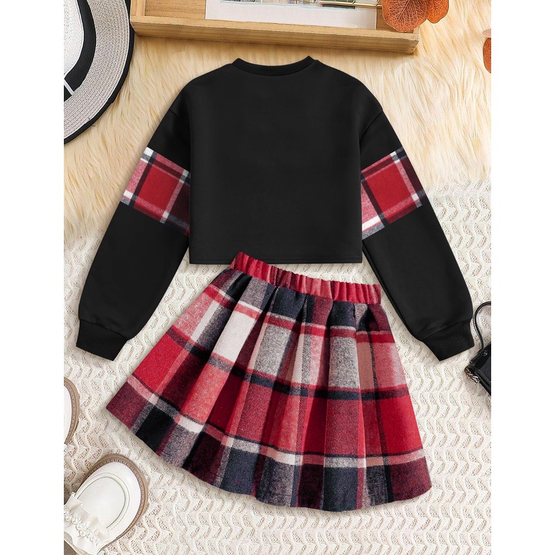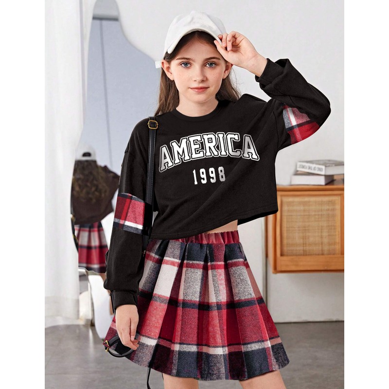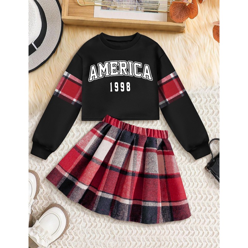 - ✨【2-Piece Outfits】Long sleeve letter print 'America 1998' pullover sweatshirt, charming plaid mini skirt. Whether she's attending a family gathering or going to school, she'll exude confidence and charm.