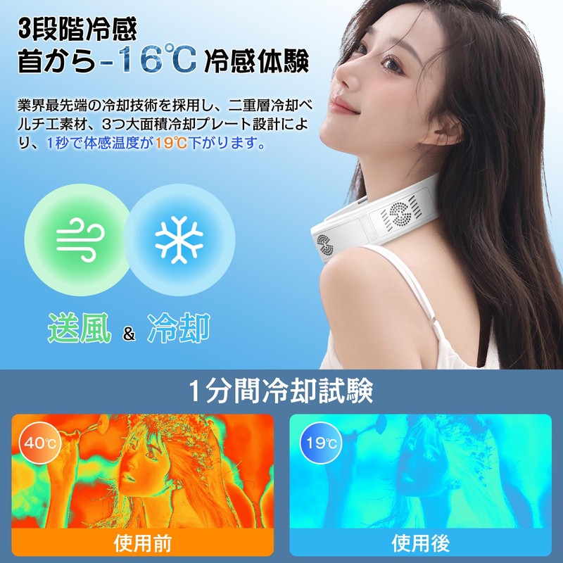 - 【1S Rapid Cooling with Advanced Semiconductor Technology】This neck fan combines the fan wind and cooling plate that touches the neck to keep you comfortable. Instantly delivers a powerful cooling sensation from the neck to the entire body, and the temperature of your body decreases to -16 degrees Celsius. This neck fan is a great way to keep the heat out of the office, housework, work or school! Stay cool in the hot summer with a neck fan! It is a must-have item for heat prevention, and it makes a great gift for Father's Day, Mother's Day, birthdays, celebrations, anniversaries, etc