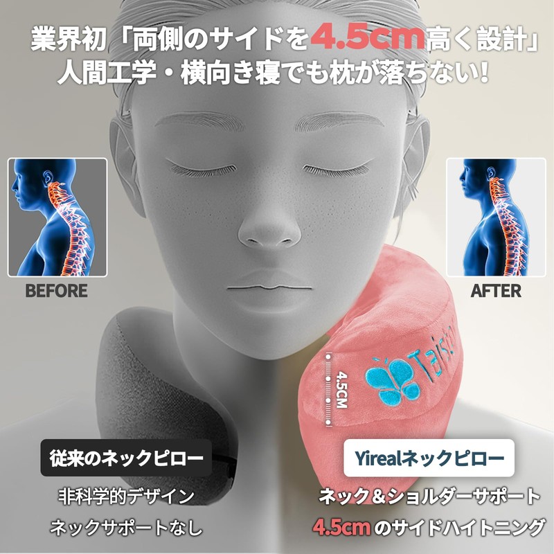 - [Industry's first 3D support structure, horizontal sleep revolution] This Yireal neck pillow features the dual guard system that has been analyzed and completed by the Sato team feedback of 200,000 users. 1. The industry's first design is 1.8 inches (4.5 cm) higher. Effectively supports the neck and reduces discomfort when sleeping on the side. The pillow does not fall off even when you sleep on the side. It cradles the side head and holds the head stable in a swinging car. ❷▼Industry First Flat Back Design▼ Unlike other products that tend to sag or pinch up, Yireal Neck Pillow Back Neck Support Area is a flat design that fits perfectly on the back and seat to eliminate the gap between the backrest. Prevent neck tilting forward, avoid discomfort caused by sagging back of neck and reduce strain on neck and spine