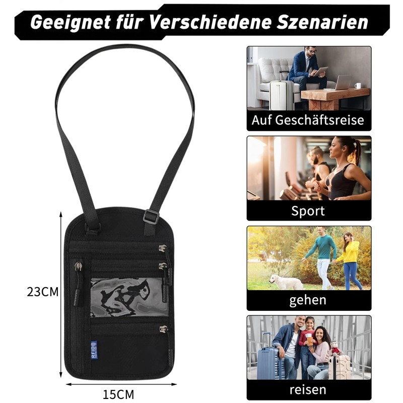 - Chest Pocket with RFID Protection The chest pocket blocks RFID radio frequencies and protects you from digital theft. The RFID protection neck bag makes your valuables very safe, protects your privacy and prevents leakage of personal data, bank card numbers and other related data