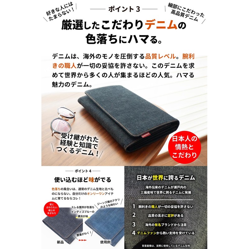 Beware of imitation products: These denims are carefully selected from Okayama denim, made in Japan, and are completely different from the "quality" and "color fade" rather than a notebook-type case made of denim material that looks similar at first glance.