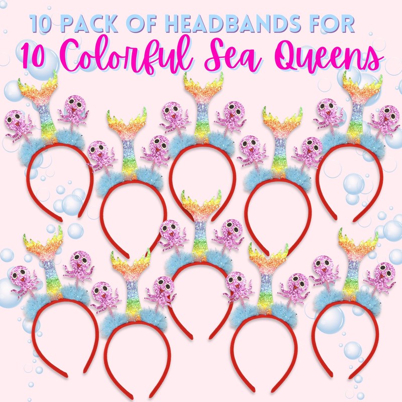 - PREMIUM QUALITY: Crafted with attention to detail, these headbands are made from high-quality materials that are durable and long-lasting. The glittery rainbow mermaid tails and octopus details are securely attached, guaranteeing they will shine throughout the party.
