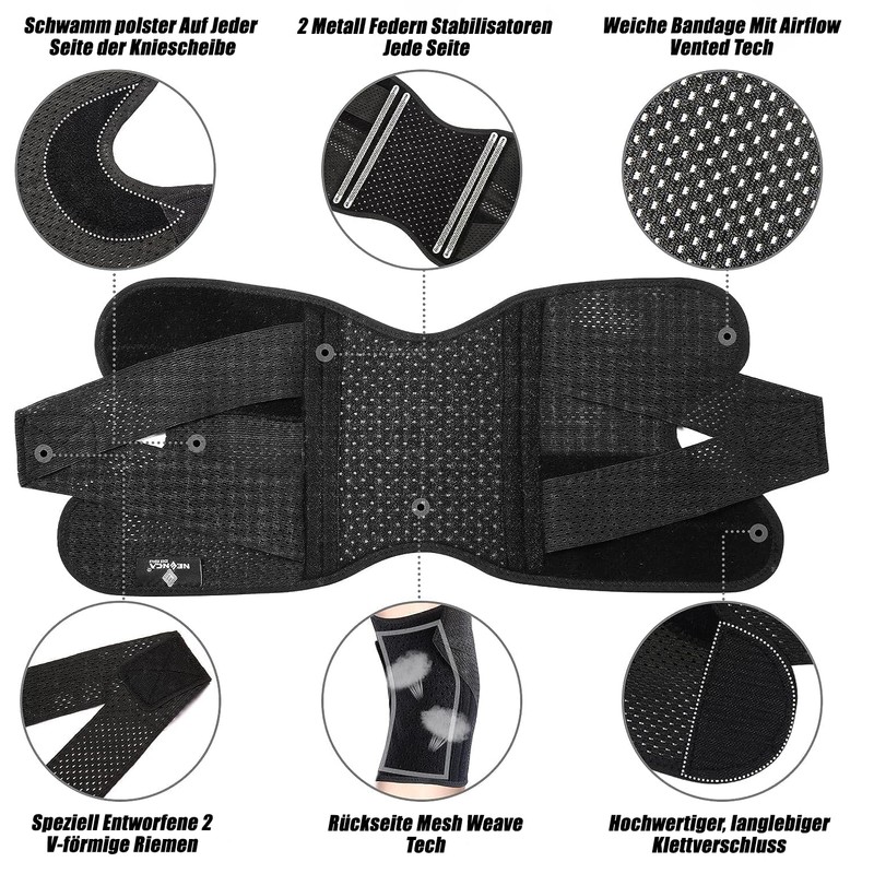 • NEENCA -KNEE SUPPORT TECHNOLOGY - Two metal spring stabilisers (4 springs) fit snugly to your knee joint, 2 specially designed Velcro closure systems for optimal fit, open patella and back design and ultra-soft bandage with mesh fabric technology. These special functional components strengthen side support and maintain the stability of your joint. They effectively distribute pressure on your knee and support recovery after a knee injury. The best choice for sports protection and pain relief