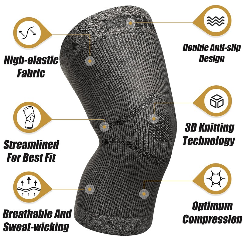- BETTER PERFORMANCE— Innovative functional fabrics has the effect of keep your knee warm and reduce stiffness, reducing inflammation and swelling, increase oxygen flow. So it will prevent potential sports injuries without sacrificing your performance! Non-slip gel strips and high-elastic Graphene fabric to avoid slide or roll during exercise, and knee sleeve can be worn day and night for 24/7 recovery, It will stay in place all day!