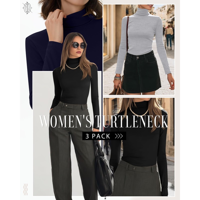Neer 3 Pack Cotton Women's Turtleneck Long Sleeve Tops Thermal Underwear Base Layer Fall Winter Shirts Sweater(S,Black, Light Gray,Navy Blue)