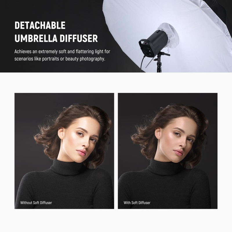 - 【Detachable Soft Light Diffuser】 This white diffuser minimizes the overly bright highlights that may occur when using a silver umbrella, and achieves an extremely soft and flattering light for scenarios like portraits or beauty photography. Attach or detach using touch fasteners for a swift and simplified setup