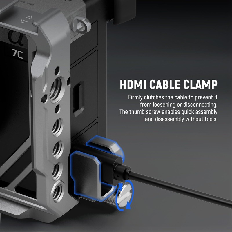 An HDMI cable clamp can be hand tightened to the cage and ensure a stable cable connection.