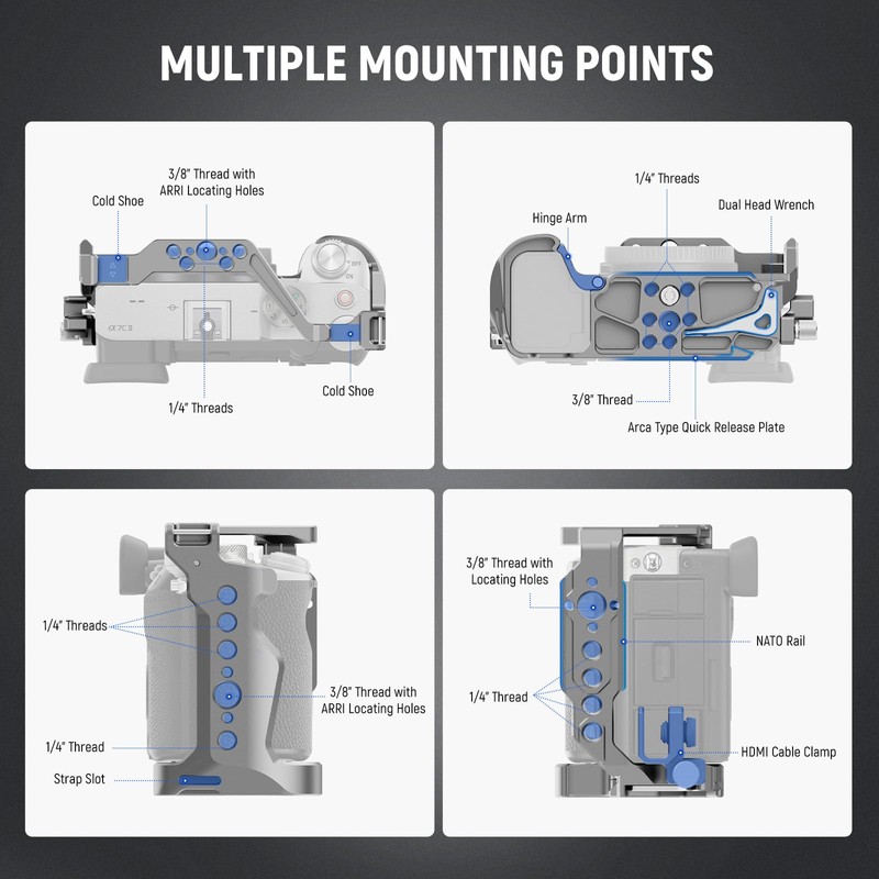 - 【All in One Full Cage Kit for Alpha 7C II & Alpha 7CR】 Fully compatible with Sony Alpha 7C II and Alpha 7CR cameras, this formfitting cage ensures full access to the buttons, ports, articulated LCD screen, battery compartment, and keeps the hot shoe unobstructed for mounting microphones or speedlites. Made of CNC machined aluminum alloy, this durable yet lightweight cage can protect the camera from scratches and bumps