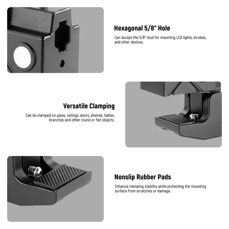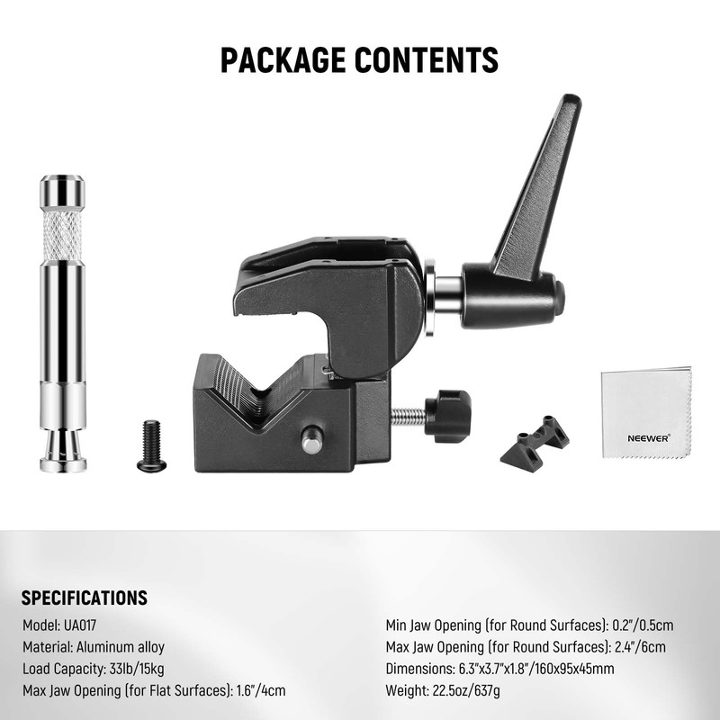 - 【Heavy Duty Camera Clamp Mount】 Made of black anodized aluminum alloy for exceptional strength and durability, this heavy duty super clamp weighs only 22.5oz (637g) yet supports equipment weighing up to 33lb (15kg). Ideal for securely mounting cameras, LED video lights, ball head phone holder and other photography gear on poles, tripods, bike or motorcycle handle bars, clip to desks or other flat surfaces as content creator essential and influencer must have photography accessories