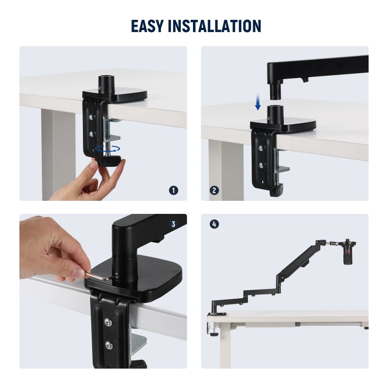 The spring loaded arm with pneumatic counterbalance system minimizes noise and vibrations during movements, and the enlarged C clamp with non slip pads secures to 0.4"-3.1"/10-80mm thick tables. Upgraded with a two section bottom bracket and a stretchable spring load arm, extending in total up to 30.2"/767.7mm horizontally and 11.9"/302mm vertically.