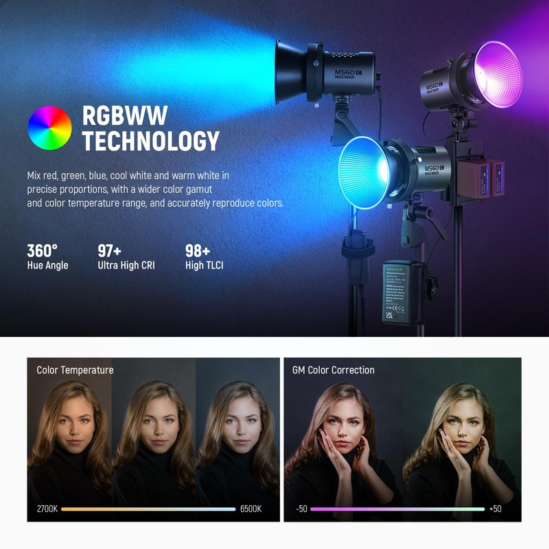 - 【RGBWW Color Mixing & PWM Dimming Photo Light】 MS60C RGB Video Light uses RGBWW light mixing for enhanced color rendition and linear PWM dimming technology to break the minimum brightness limit from 1% slightly bright (brightness and power are genuinely at 1%) to 100% ultra bright. This video lighting features 2700K-6500K color temperature, 65W high output, 8300lux/1m (41000lux/0.5m) max illuminance, CRI97+/TLCI98+ premium lighting with 1/2000s flicker free and high color reproduction