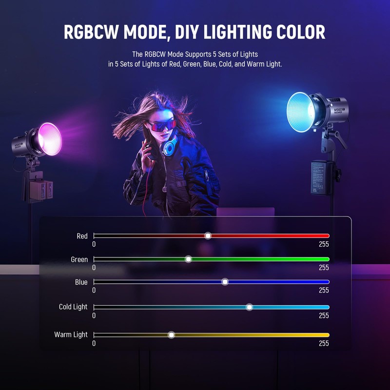 - 【RGBCW Mode & 17 Special Effects Continuous Lighting for Photography】 MS60C continuous output lighting has 4 light modes: CCT for 2700K-6500K color temperature & precise GM color correction; HSI for 360° hue angles & 0-100% saturation; RGBCW for individual adjustment on red, green, blue, cool white, and warm white for customized colors; and FX for 17 special effects that make videos more realistic