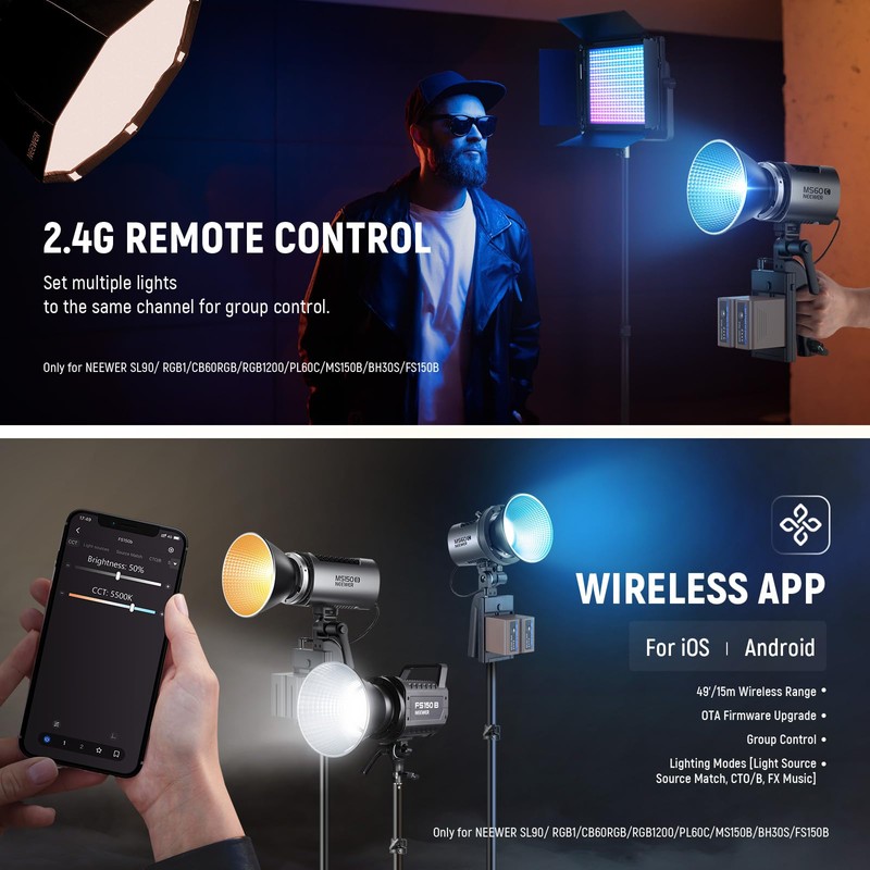 - 【App & 2.4G Wireless Light Control】 You can control this studio lighting with the physical buttons or use the NEEWER APP with Infinity technologies for multiple light controlling and OTA firmware updating. The 2.4G system supports group control on different LED lights set in 00-99 channels within 65ft/20m. When several lights are set in the same channel, controlling one can make others change in tandem