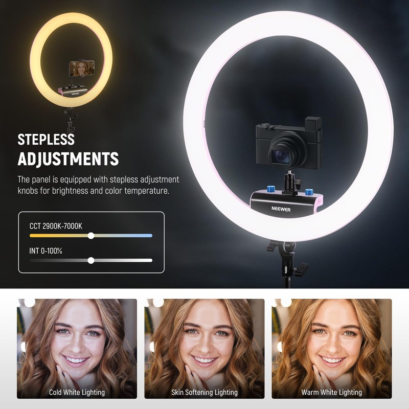 • 【Softer Light & Enhances Facial Contour】 With 320 high quality LED beads, precisely adjustable brightness (0%-100%), and color temperature (2900K-7000K), this ring light ensures flicker free, glare free illumination. Its soft light board creates a gentle glow that enhances skin tones, and creates charming eye highlights. Reach up to 3300Lux@0.5m for uniform lighting without shadows. The CRI97+/TLCI98 delivers true to life colors