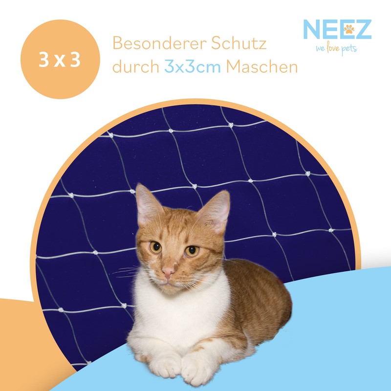 NEEZ Cat Net for Balcony and Window. Transparent Protective Net Including Attachment Set. Attachment of Cat Protection Net for Balcony without Drilling, 3 x 8 metres