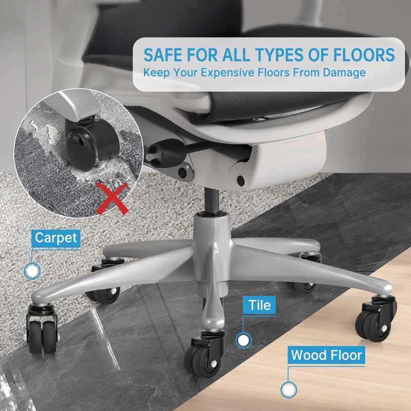 - No Scratch for All Floors: Our wheels for office chair are specially designed to protect hardwood, laminate, tile, slate, and all other hard floors from potential damage. You do not require chair mats at all. Suitable for most existing office chair models-salon chairs, work chairs, executive chairs, rolling stools