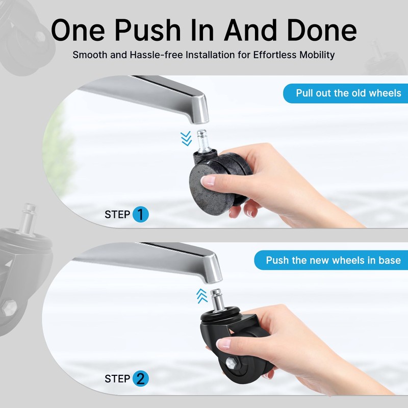 - Tool Free Installation: No tools are required. Pull off the old casters and insert the new heavy duty office chair wheels until the stem is firmly seated and secured. Just take two minutes to replace the new chair wheels and enjoy the company of Nefish chair wheels for a long time. Please do not hesitate to contact us if you have any inquiries, your issues will be solved within 24 hours