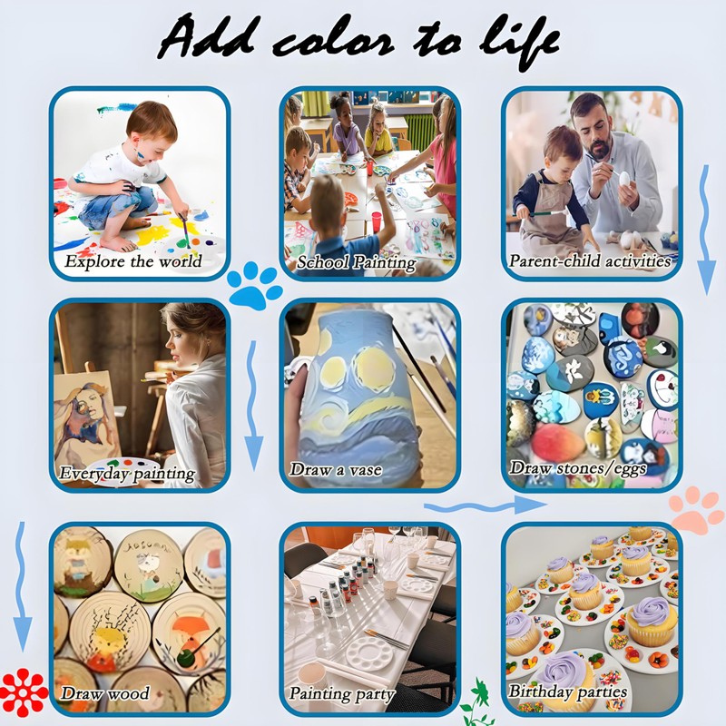 - 【Complete Painting Set】 This set includes 30 painting supplies, such as 10 color palettes, 10 round-headed brushes, and 10 flat-headed brushes. It is ideal for various painting needs in school, outdoor settings, and at home, sparking children's imagination.
