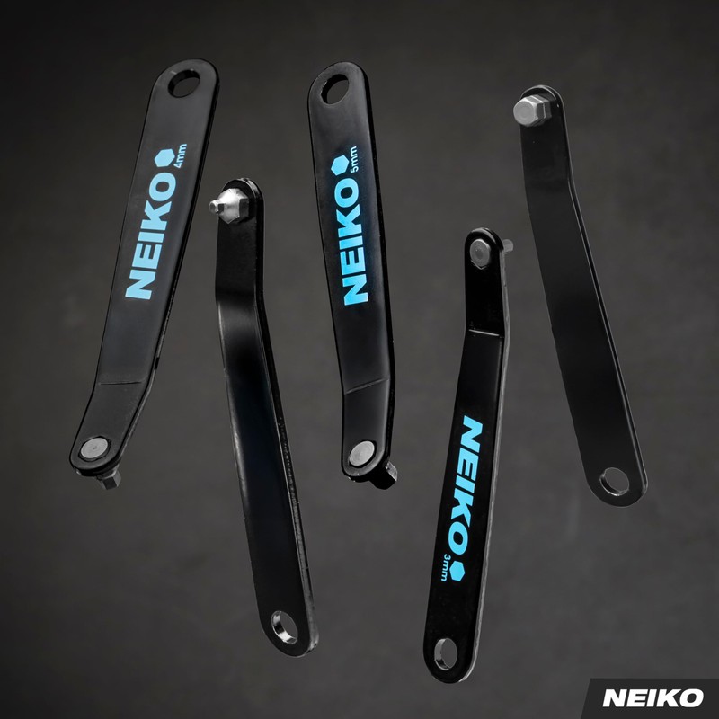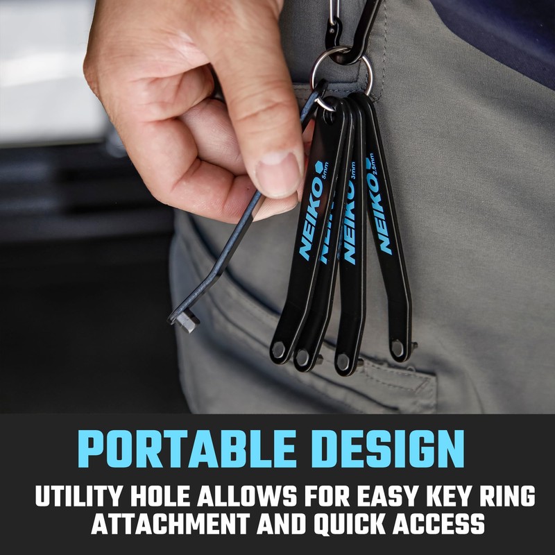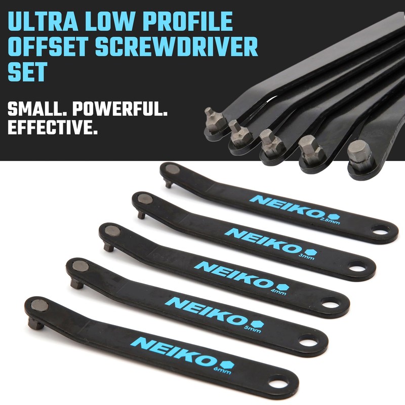 NEIKO 01321A Ultra Low Profile Offset Screwdriver Hex Set, 5 Pc, Heavy Duty S2 Steel Construction, MM, 10mm Bit Depth, Angled Hex Bit, Bent Screwdriver for Tight Spaces, Allen Wrench Keychain