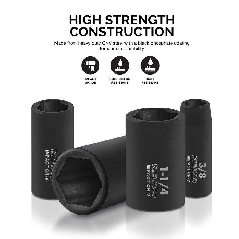 Neiko 02476A 1/2" Impact Socket Set, 14 Piece 6 Point Impact Set, Standard Impact Socket Set, SAE Sizes (3/8-Inch to 1-1/14") Cr-V Steel, Deep Socket Set 1/2 Drive,