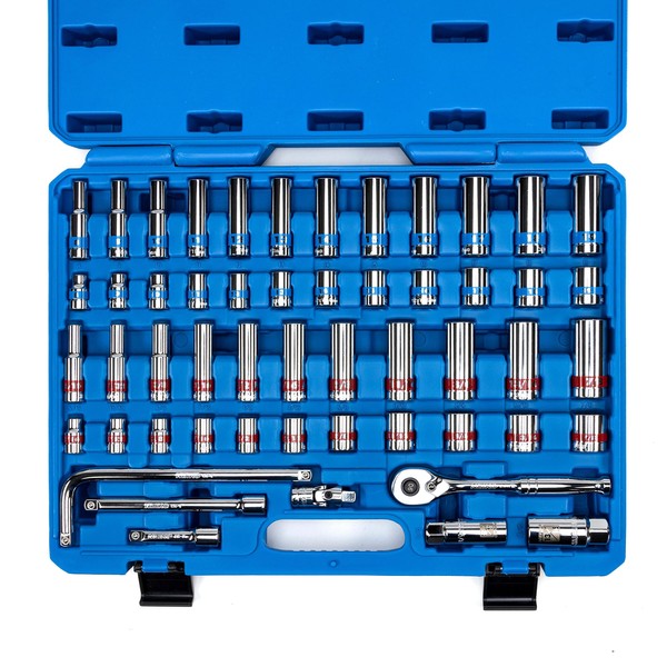 - RATCHET SOCKET SET: This 53-piece wrench set combines both metric and SAE sizes to create the ultimate ratchet and socket kit. It includes standard and metric shallow and deep socket sizes to fit large and small sockets.